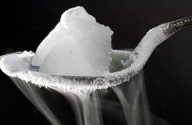 干冰是固態二氧化碳,其汽化熱在-60℃時為365J/K。在常壓下汽化時可使周圍溫度降低至約-78℃,并且不會產生液體,因此被稱為干冰。常見的干冰形態包括塊狀和丸狀。現代制備干冰的方法是在大約6250千帕的壓力下,將二氧化碳冷凝成無色液體后,再在低壓條件下迅速凝固得到。