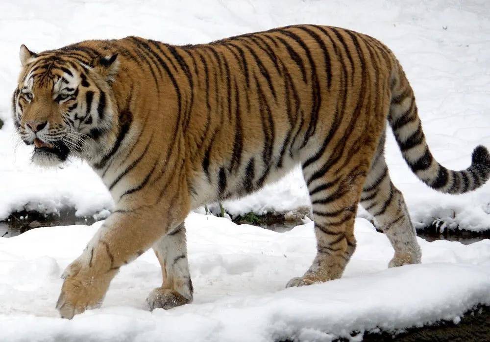 東北虎,亦稱西伯利亞虎、烏蘇里虎等,是現存最大的虎亞種之一。其背側體色為橘黃色,帶有黑色條紋,腹面則為白色。冬季時,東北虎的毛長且蓬松,顯得非常粗壯。成年雄性東北虎平均體重約為250千克,頭體長約為2.3米;成年母虎的平均體重約為170千克,體長約2米,肩高約1.1米,尾長約1.3米。最大身長可達2.9米(含尾長)。