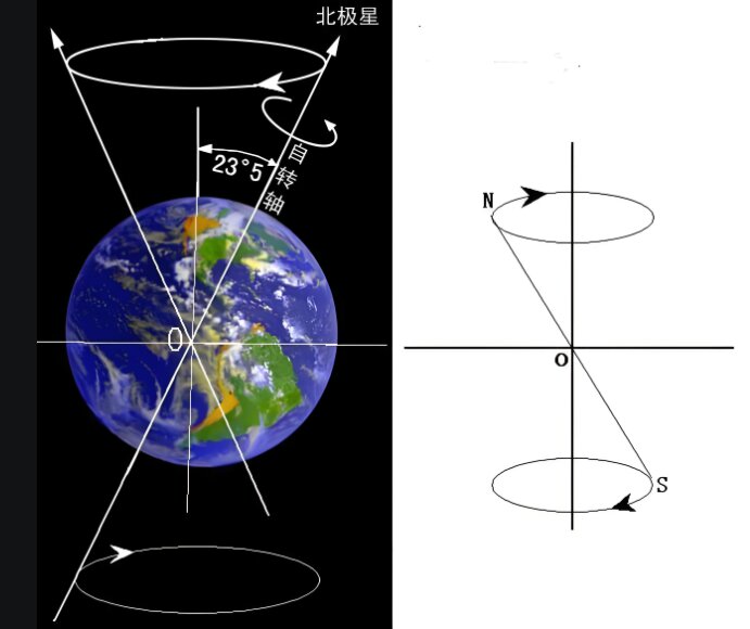 現(xiàn)在所采用的解說是后來哥白尼提出的:地軸的方向在空間不固定,但它與黃道所成的交角不變,其運(yùn)動(dòng)的軌跡是一圓錐,因而北天極在恒星天球上所行經(jīng)的路線是一個(gè)黃緯為(90°-ε)的小圓。春分點(diǎn)以每年50.26〃的速度在黃道上西移,約26000年移動(dòng)一周,這也就是北天極繞黃極運(yùn)行的周期。