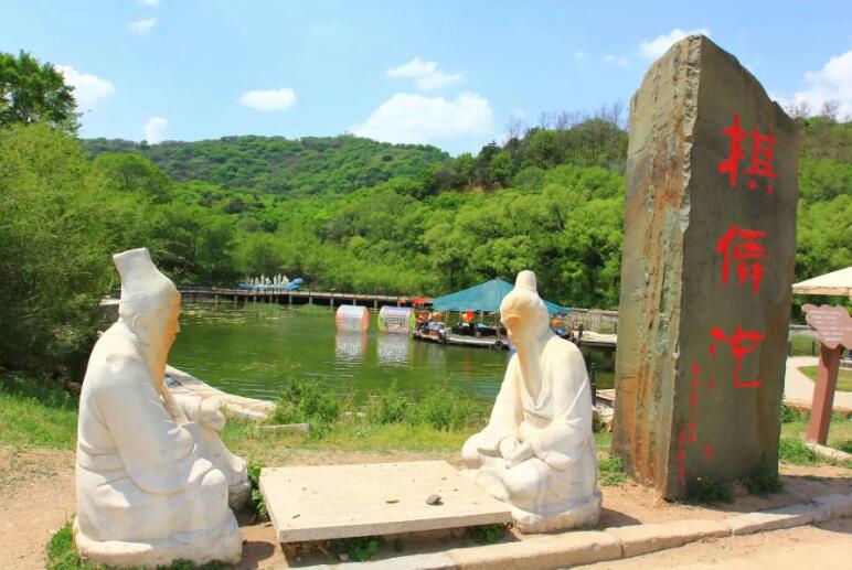 棋盤山山頂南側有一個巨大的石棋盤,下側刻有“星落石枰”字樣。這塊古老的棋盤石也是棋盤山的起源的名字。傳說在一次神仙聚會后,鐵拐李和呂洞賓一起返回,并越過了一座奇怪的山在山頂上,有一塊看起來像棋盤的光滑的大石頭。二仙突然想下棋,賭鐵拐李 的葫蘆經過幾十回合的戰斗,呂洞賓贏了,兩位神仙笑著離開了。所以你可以看到門口的雕塑,葫蘆放在呂洞賓后面。清代盛京著名學者苗公恩曾在他的詩中寫道:楊珊岸邊有一塊大石頭,又平又寬,據說是仙女棋盤。